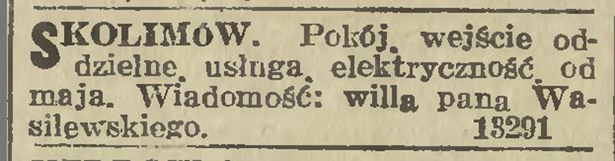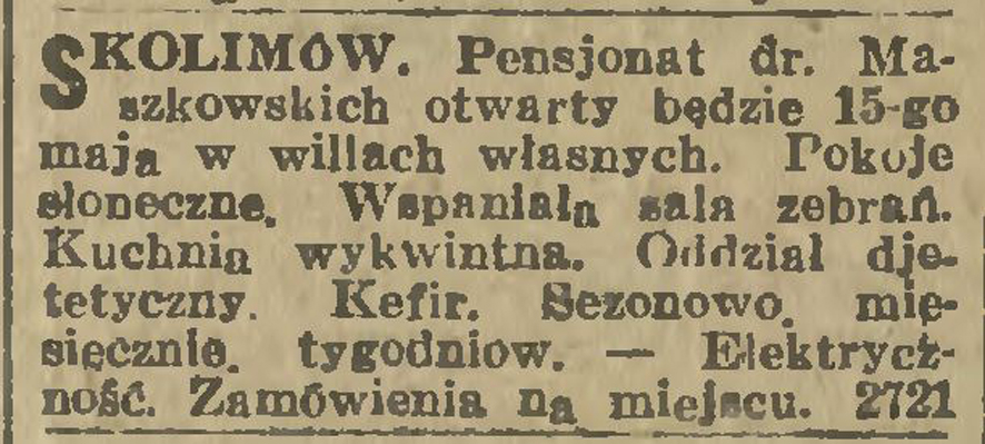 Wieczorne wydanie „Kuriera Warszawskiego” z soboty 28 kwietnia 1917 r. umieściło oferty kilku skolimowskich pensjonatów: