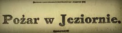 W odległej o trzy mile od Warszawy Jeziornie, położonej tuż przy kolejce wilanowskiej, szalał wczoraj pożar. O godz[inie] 5-ej po poł[udniu], zaraz po przejściu pociągu, wychodzącego z Warszawy o godz[inie] 3 min[ut] 40 po poł[udniu], zapaliła się stojąca prawie przy samym torze wielka stodoła gospodarza Latoszka. W jednej chwili ogień ogarnął całą stodołę i przeniósł się na sąsiednie zabudowania.