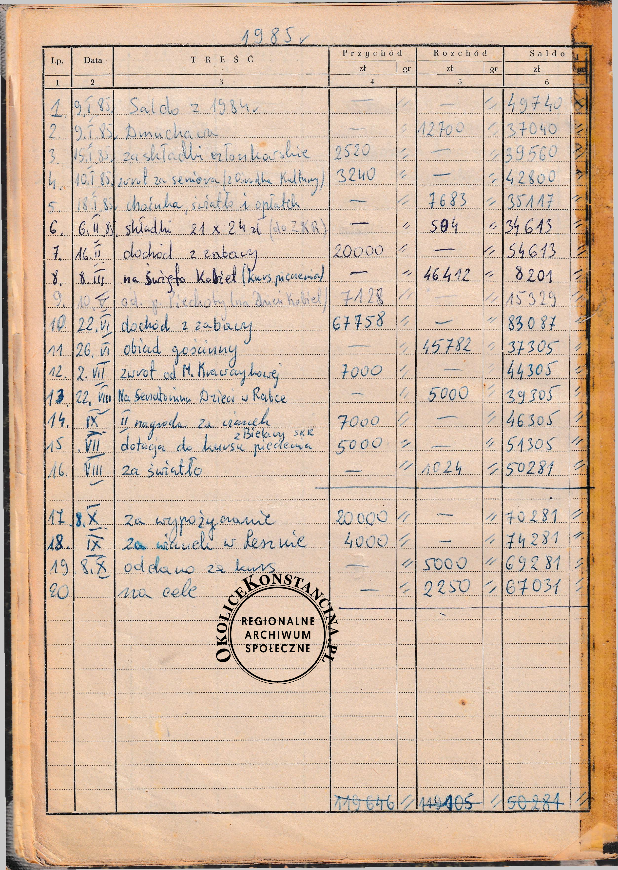 Księga kasowa Koła Gospodyń Wiejskich w Gassach zawierająca wpisy z lat 1964-1991 r. jest niezwykle ważnym dokumentem życia codziennego, nie tylko dokumentującym działalność KGW, ale również przemian społecznych w Polsce. Księgę prowadziła skarbniczka Koła. Przez wiele lat była nią, nieżyjąca już Stanisława Kanabus. Warto zapoznać się z dorocznymi wpisami dokumentującymi nie tylko wydatki na zwyczajowe imprezy, ale także działalność społeczną i kulturalną. Oryginał przechowywany jest przez przewodniczącą utworzonego w 2024 r. koła Grymle z Urzecza – Koło Gospodyń i Gospodarzy Wiejskich w Gassach. Skan księgi dostępny poniżej w formie galerii, lub do pobrania jako plik PDF.