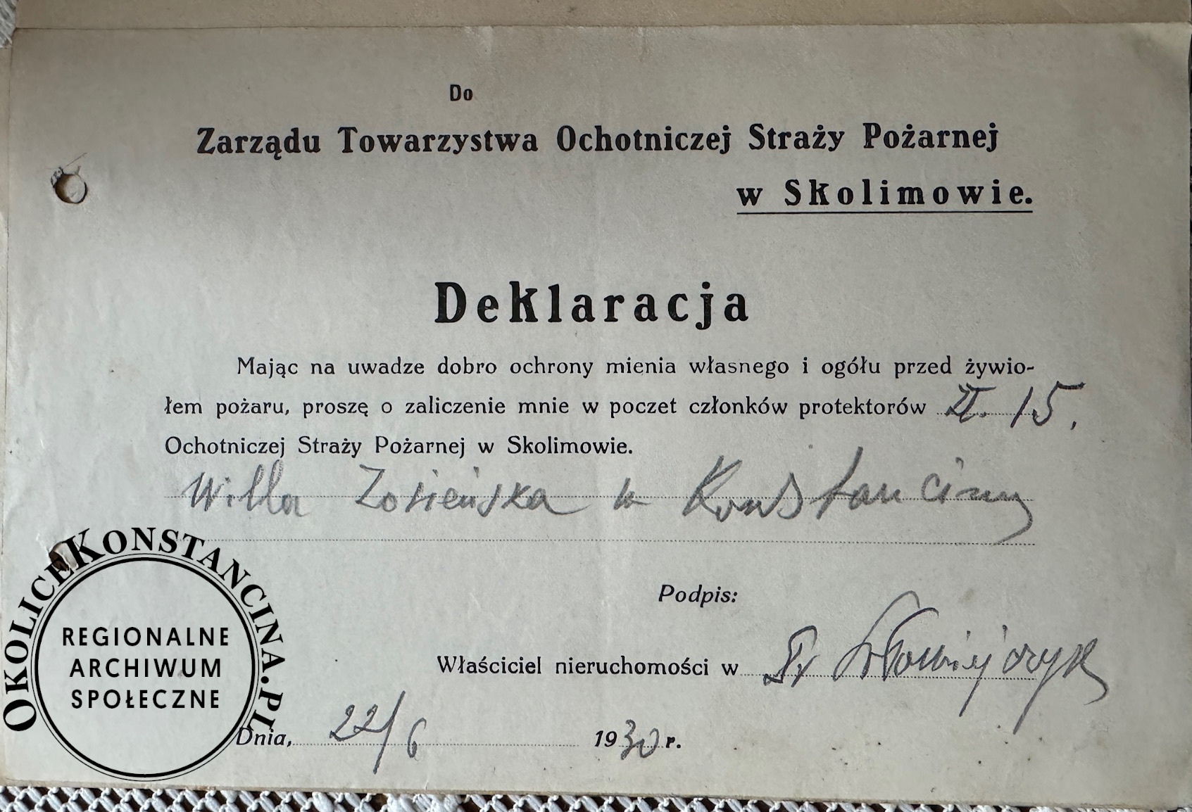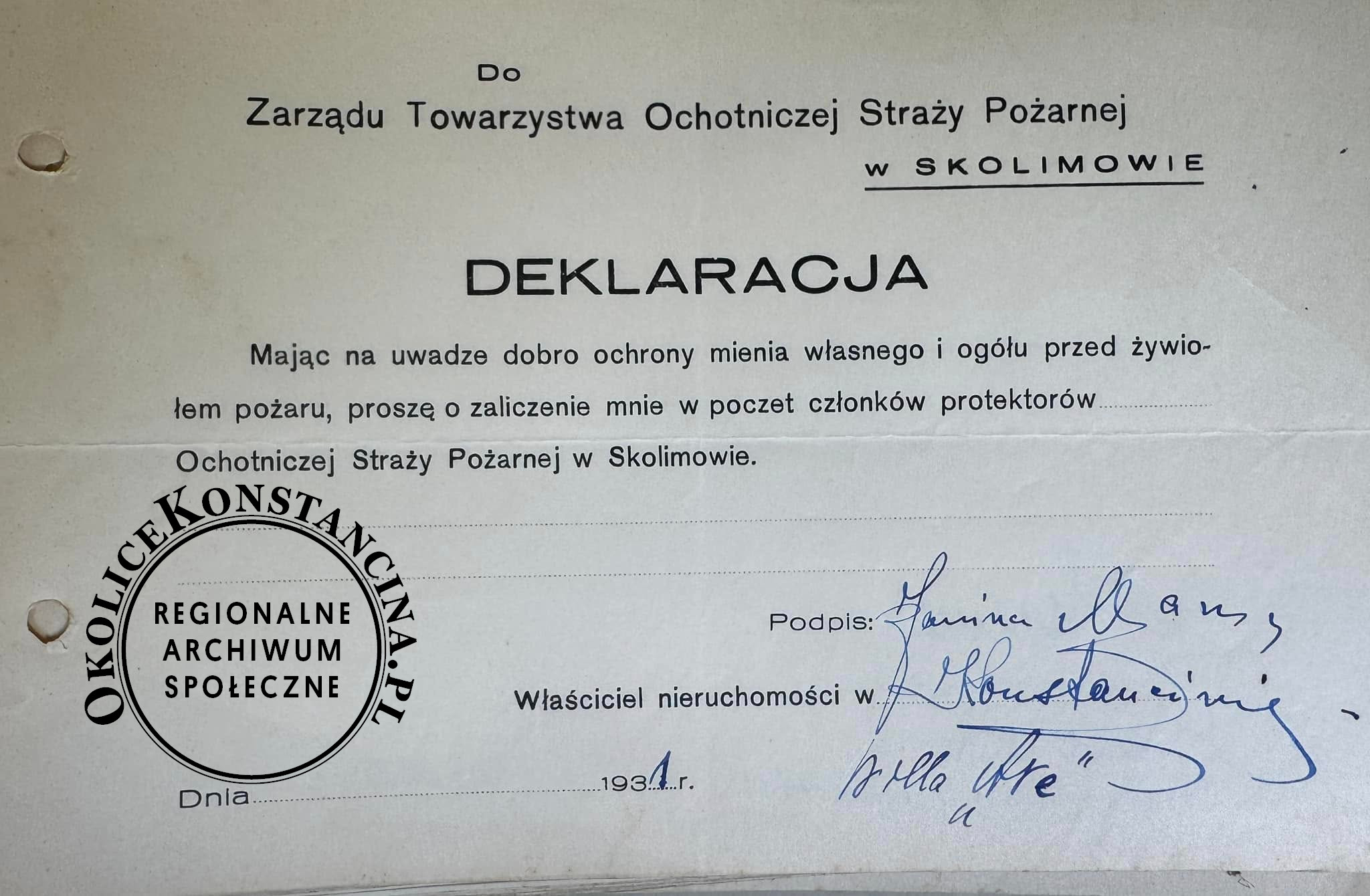 Dokumenty przyczynią się do uzupełnienia i wydania poprawionej wersji powyższej książki. Na ten moment trwa ich stopniowa archiwizacja i z uwagi na swój stan muszą być poddane odgrzybianiu. Poniżej prezentujemy kilka z nich, warto zwrócić uwagę, iż na deklaracjach członkowskich pojawiają się znane nazwiska ówczesnych właścicieli willi i mieszkańców Konstancina i Skolimowa, takie jak Jadwigi Mann, Tadeusza Likiernika czy Seydla.