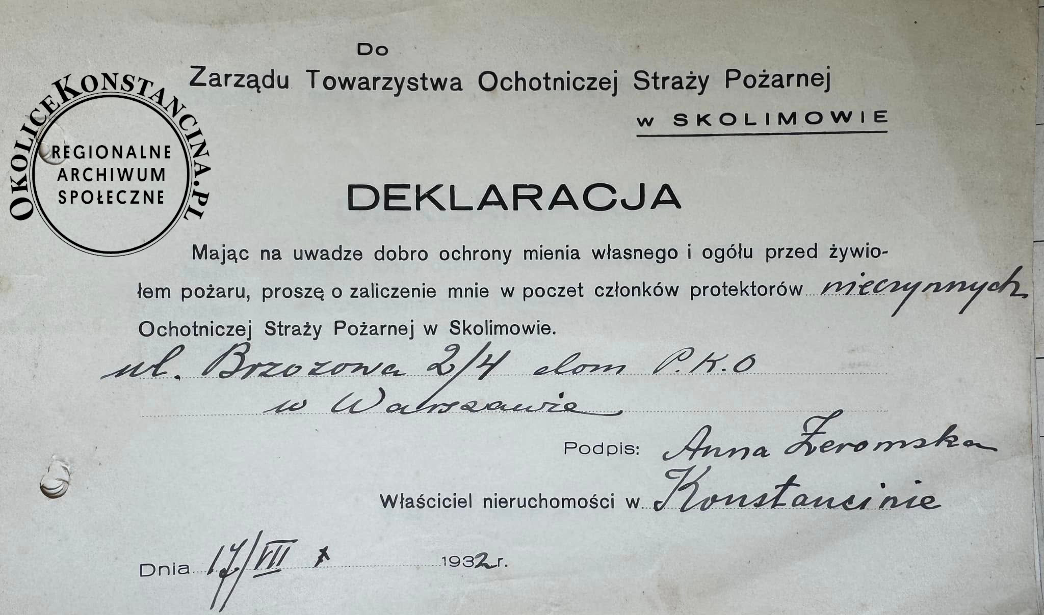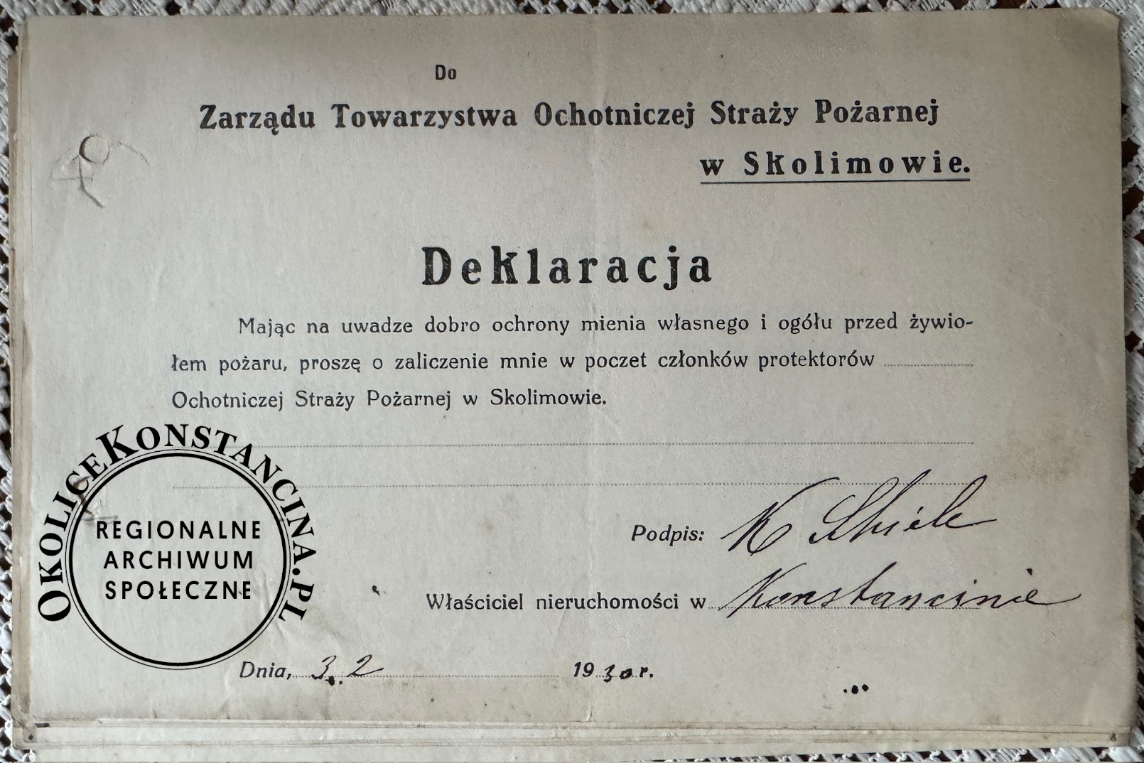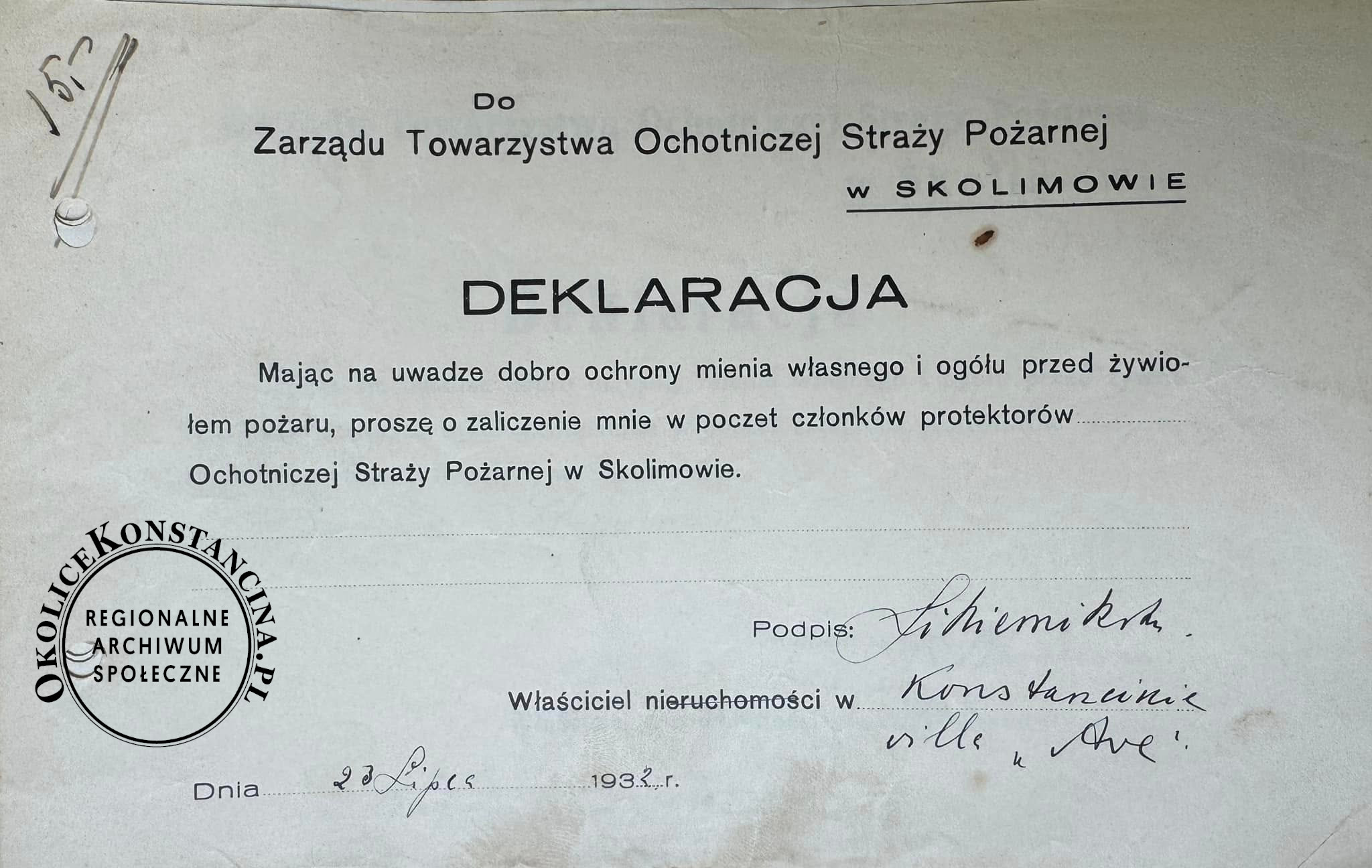 Śledzący nasze profile społecznościowe wiedzą, iż kilka dni temu, tuż przed świętem Straży Pożarnej obchodzonym w dniu 4 maja, odnaleziona została dokumentacja straży pożarnej w Skolimowie, pochodząca z czasów przedwojennych. Podobnie jak inne tego typu akta stanowi zapis codziennego funkcjonowania lokalnej ochotniczej straży pożarnej. Założona w 1917 r. w letnisku Skolimów, szybko swymi działaniami objęła także sąsiadujące willowe letnisko Konstancin, a od 1924 r. stanowiła ochotniczą straż pożarną gminy Skolimów-Konstancin. O jej działaniach i historii można przeczytać w publikacji Witolda Rawskiego wydanej w 1917 r. – poniżej można zapoznać się z nią w wersji elektronicznej, jako że dodana jest w naszym Archiwum do działu ebooki.