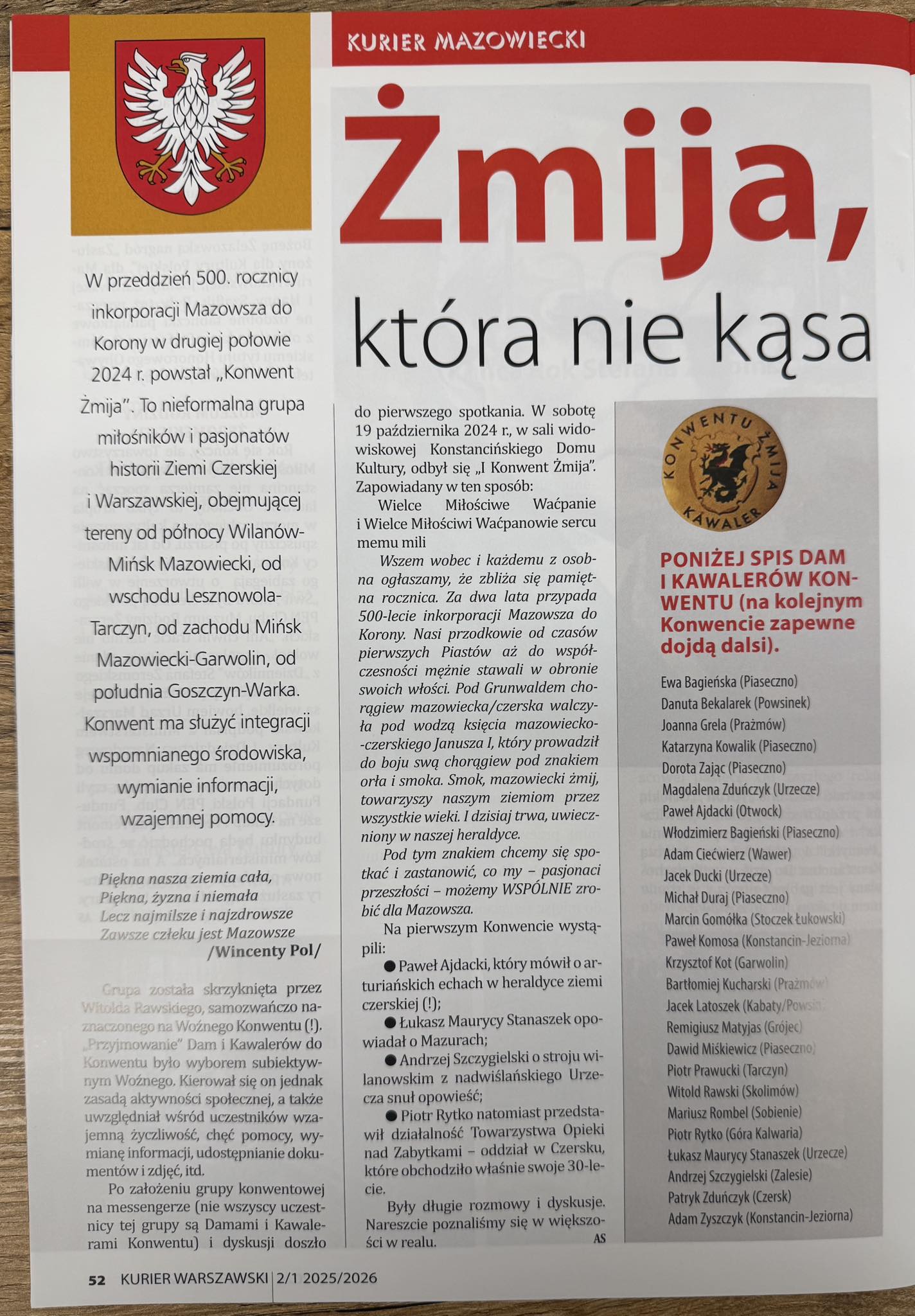 Warto odnotować, iż w „Kurierze Mazowieckim” pojawiła się informacja o działaniu Konwentu Żmija, czyli czerskiego smoka. Jest to nieformalna grupa której członkowie upamiętniają inkorporację Mazowsza do Polski w 1526 toku. Co prawda pomylono Żmija ze żmiją, ale cóż…